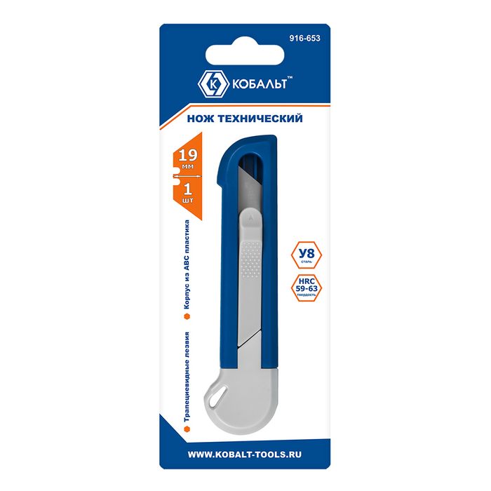 Нож технический КОБАЛЬТ "Безопасный", трапециевидное лезвие 19 мм, корпус из ABS пластика, блистер (916-653) - цена, фото, технические характеристики