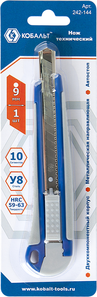 Нож технический КОБАЛЬТ лезвие 9 мм, двухкомпонентный корпус, металлическая направляющая, автостоп, блистер (242-144) - цена, фото, технические характеристики