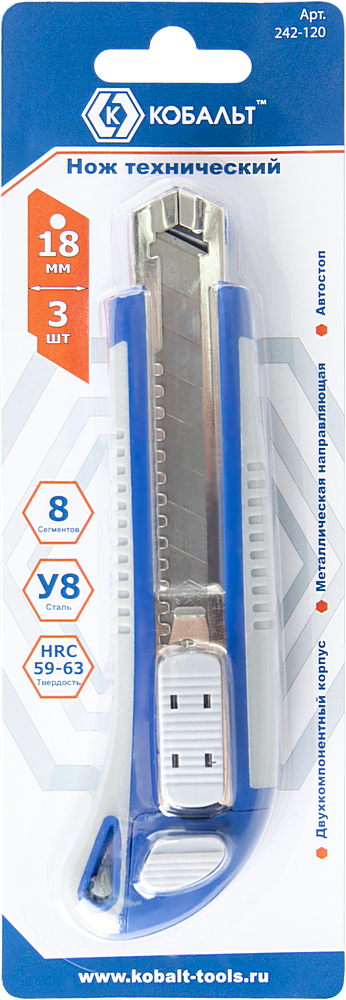 Нож технический КОБАЛЬТ лезвие 18 мм. (3 шт. в компл.), двухкомпонентный корпус, метал. напр-я, автостоп, блистер (242-120) - цена, фото, технические характеристики