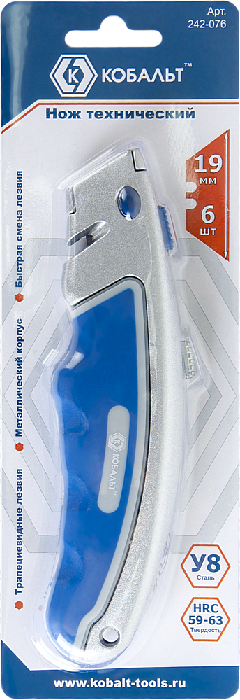 Нож технический КОБАЛЬТ трапециевидное лезвие 19 мм (6 шт. в компл.) метал. корпус, быстрая смена лезвия, блистер (242-076) - цена, фото, технические характеристики