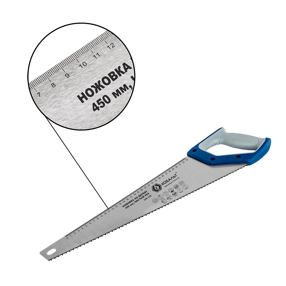 Ножовка по дереву КОБАЛЬТ чистый рез, 450 мм, шаг 3.5 мм (7TPI), закаленные зубья, 3D-заточка, 2-х компонентная рукоятка (246-128) - цена, фото, технические характеристики