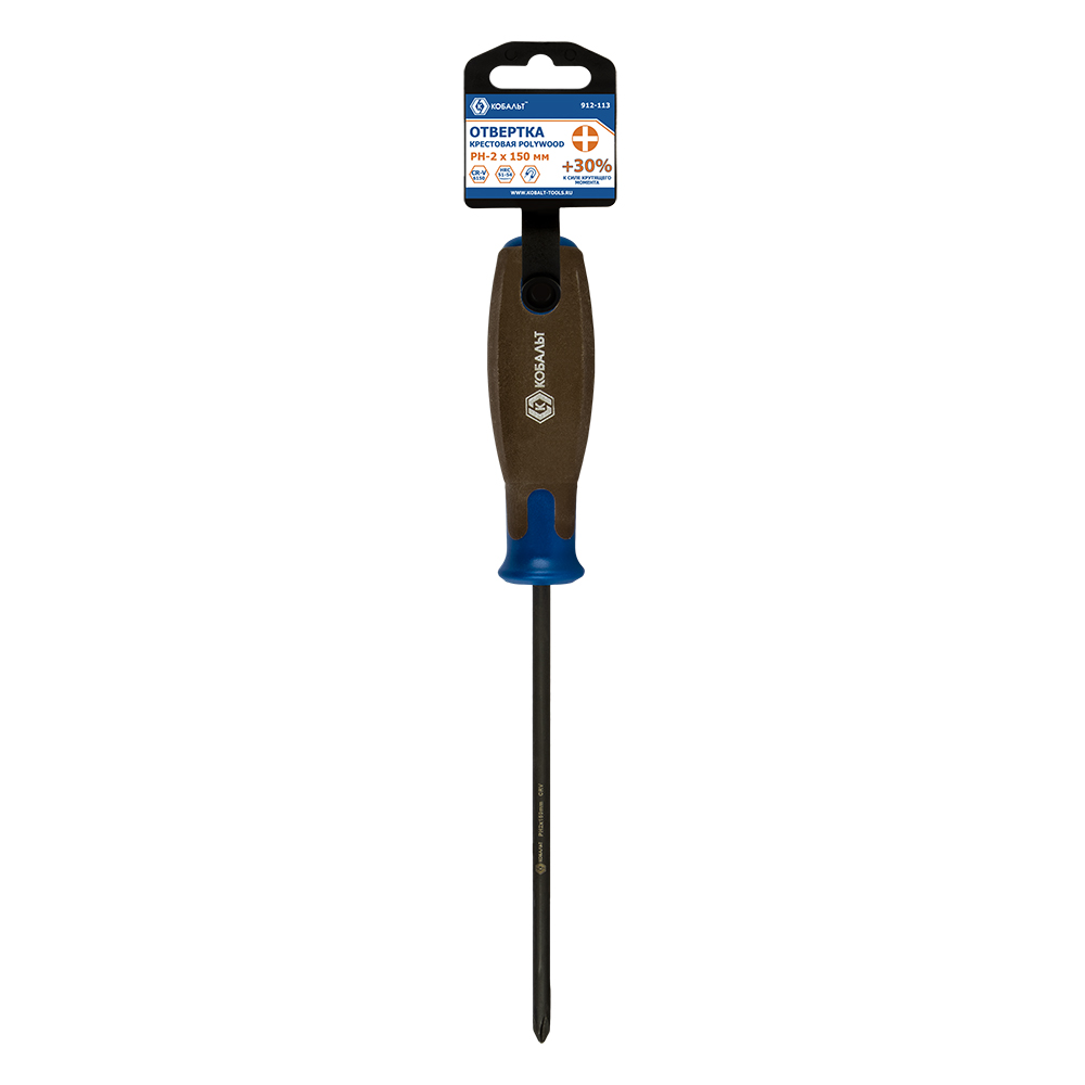 Отвертка POLYWOOD КОБАЛЬТ PH-2 х 150 мм CR-V, древесно-полимерная рукоятка, подвес (912-113) - цена, фото, технические характеристики