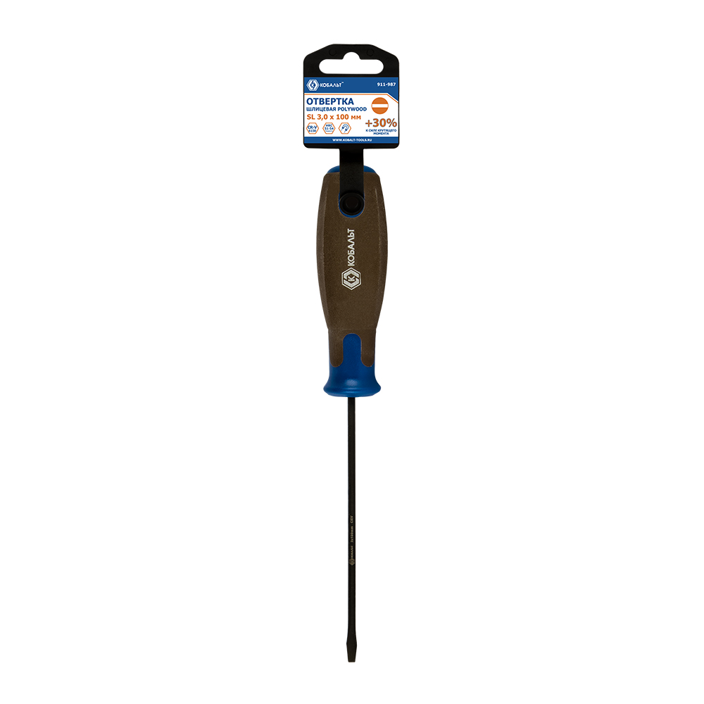 Отвертка POLYWOOD КОБАЛЬТ SL 3,0 х 100 мм, CR-V, древесно-полимерная рукоятка, подвес (911-987) - цена, фото, технические характеристики