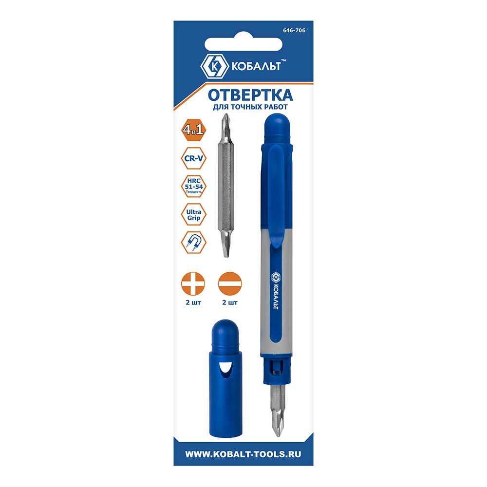 Отвертка рукоятка КОБАЛЬТ 4 в 1 с набором двусторонних бит для точных работ, блистер (646-706) - цена, фото, технические характеристики