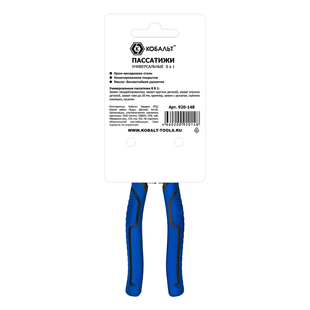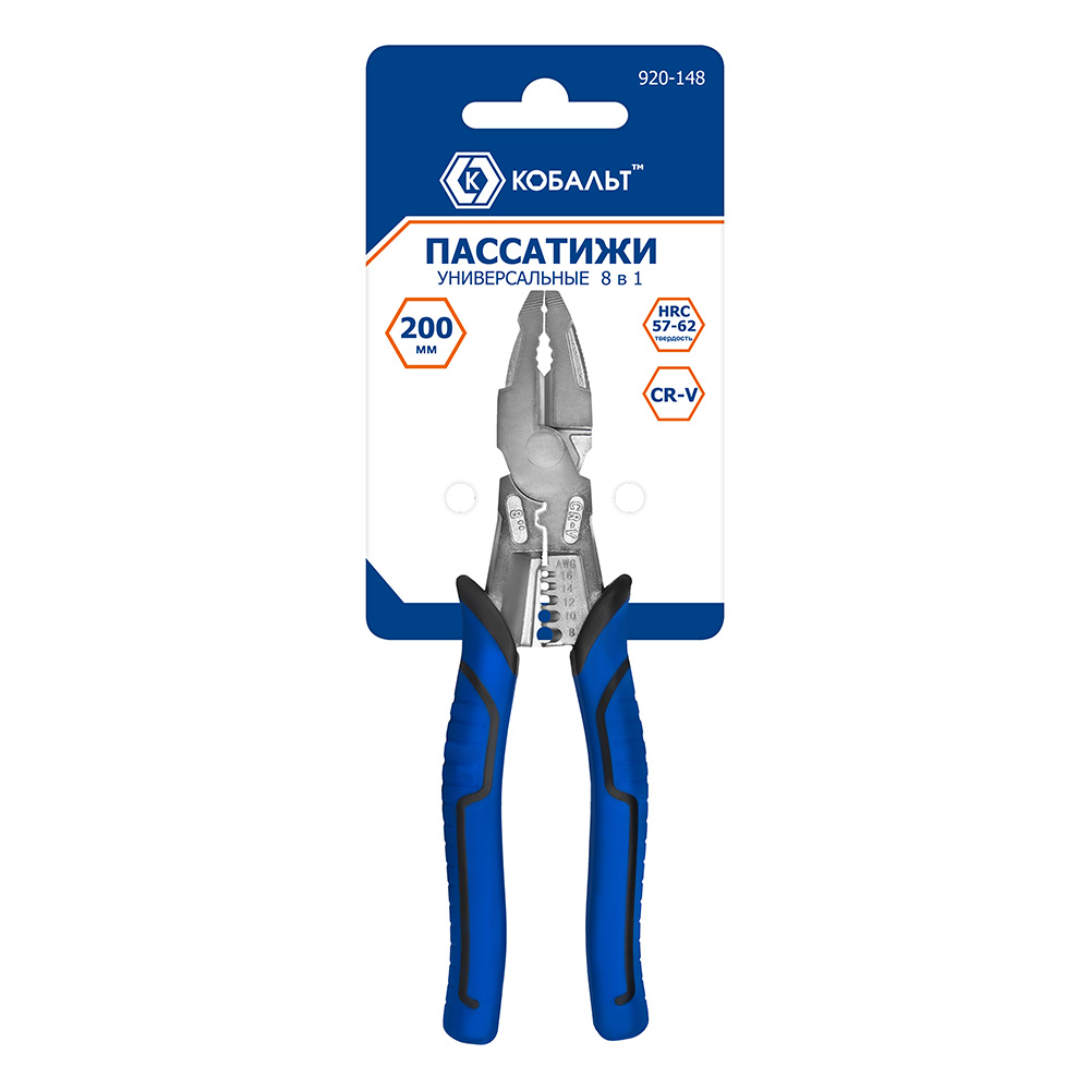 Пассатижи КОБАЛЬТ 8 В 1, УНИВЕРСАЛЬНЫЕ, 200 мм, рукоятки МБС, CR-V,подвес (920-148) - цена, фото, технические характеристики