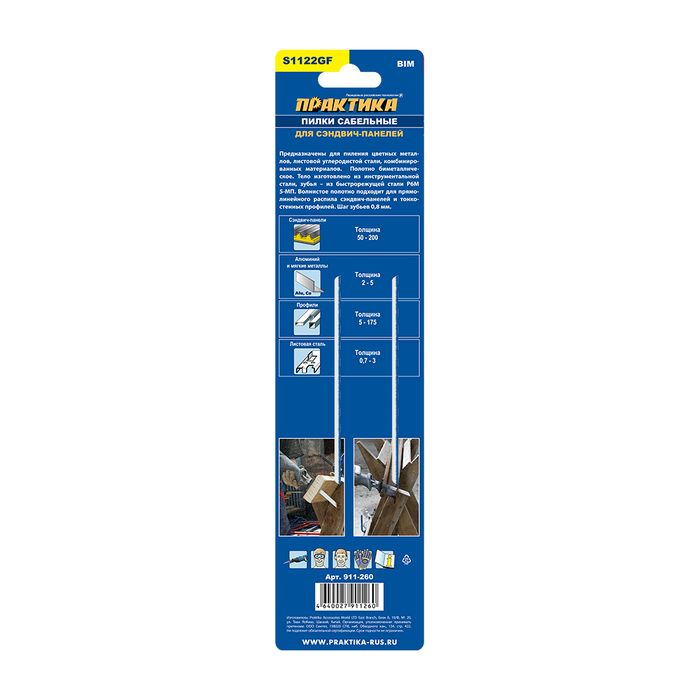 Пилки для сабельной пилы по стали ПРАКТИКА S1122GF для сэндвич панелей BIM, по мет/пласт, шаг 0.8 мм, длина 225 мм (2 шт) (911-260) BIM, по мет/пласт, шаг 0.8 мм, длина 225 мм (2 шт) (911-260)