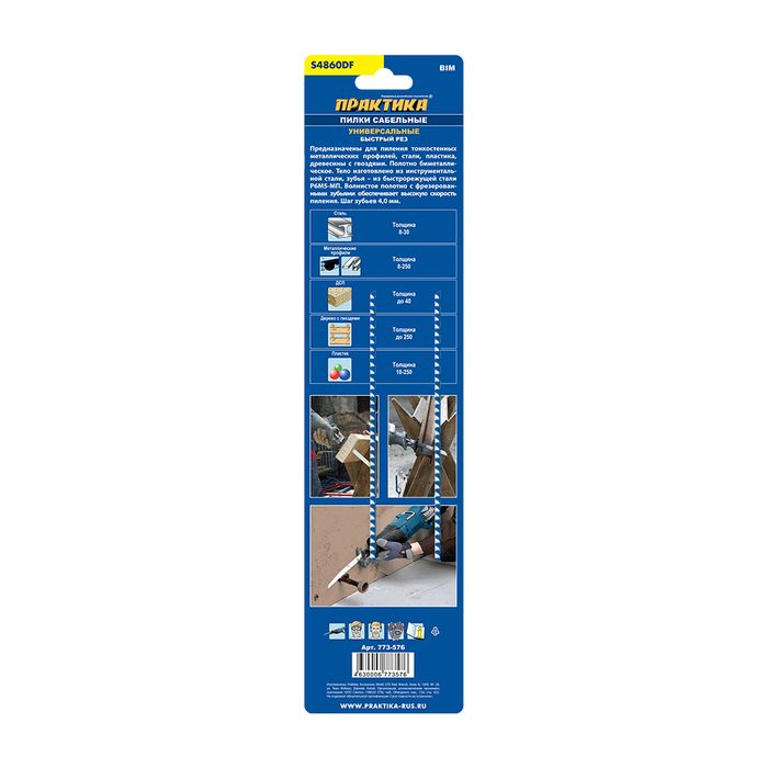 Пилки для сабельной пилы универсальные ПРАКТИКА S4860DF BIM, по дер/мет/пласт, шаг 4 мм, длина 300 мм (2 шт) (773-576) - цена, фото, технические характеристики