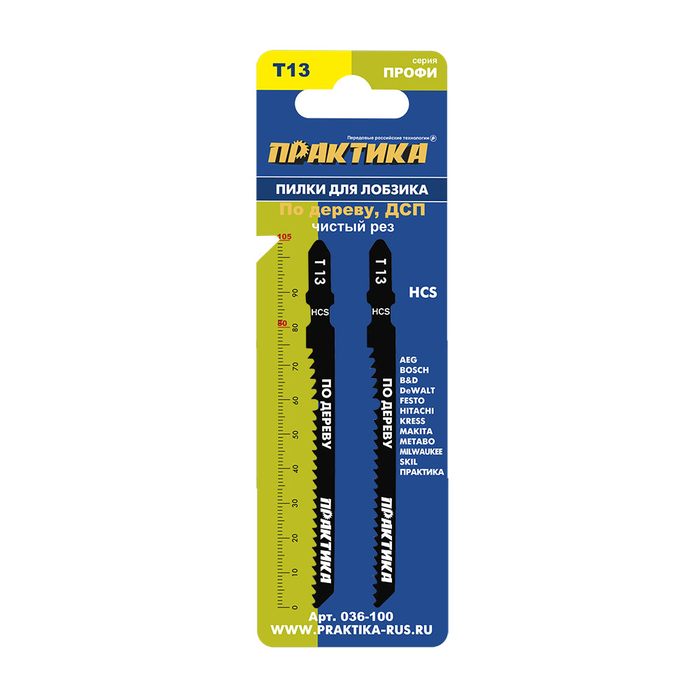 Пилки для лобзика по дереву, ДСП ПРАКТИКА тип T13 100 х 75 мм, реверсивные зубы, HCS (2шт.) - цена, фото, технические характеристики