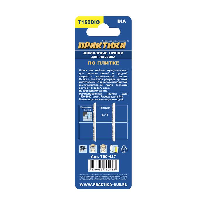 Пилки для лобзика по плитке ПРАКТИКА тип T150DIO 76 х 50 мм, криволинейный рез, АЛМАЗНЫЕ (2шт) (790-427) - цена, фото, технические характеристики