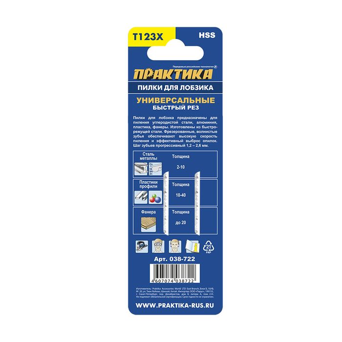 Пилки для лобзика универсальные ПРАКТИКА тип T123X Прогрессор 100 х 75 мм, грубый рез, HSS (038-722) - цена, фото, технические характеристики