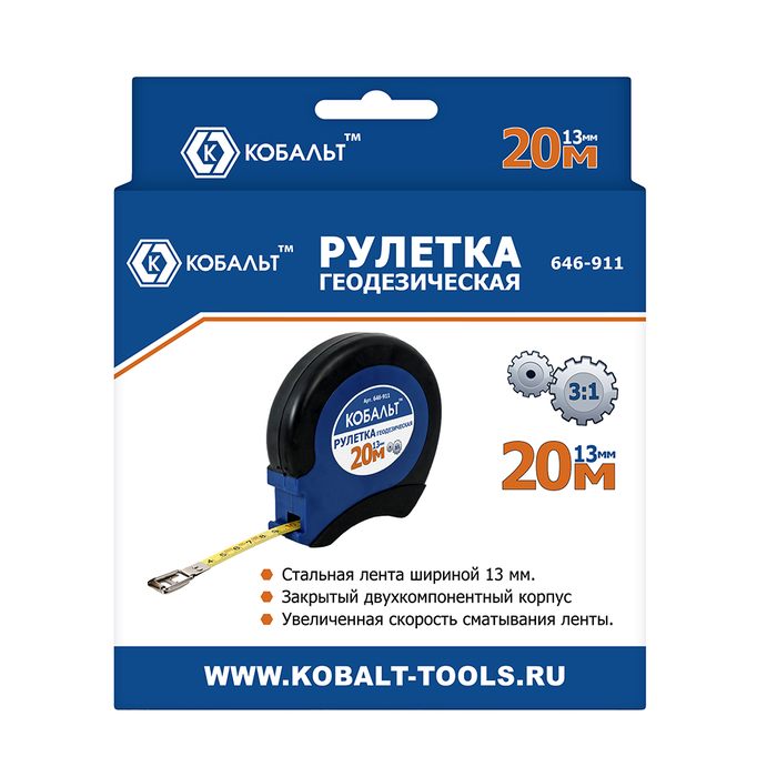 Рулетка геодезическая КОБАЛЬТ 20м x 13мм закрытый двухкомпонентный корпус, стальная лента, ускоренная перемотка (646-911) - цена, фото, технические характеристики