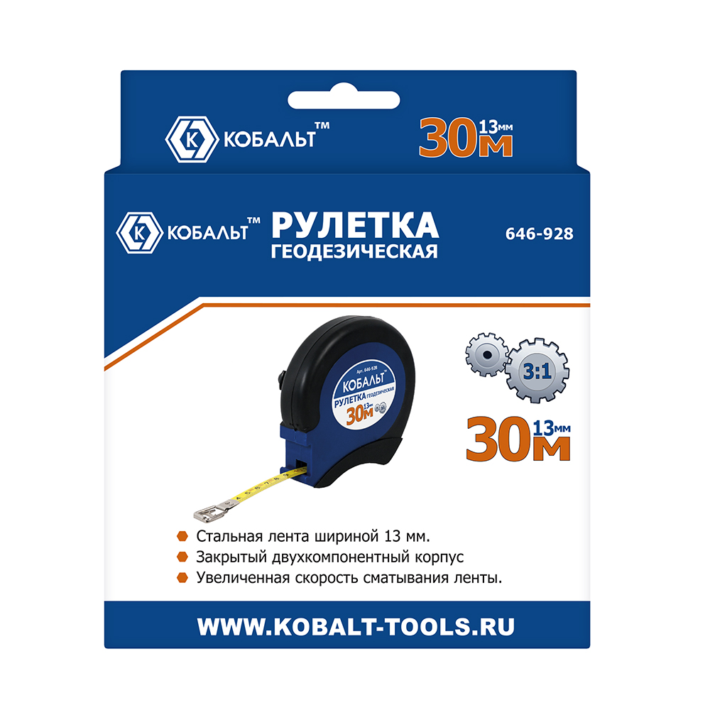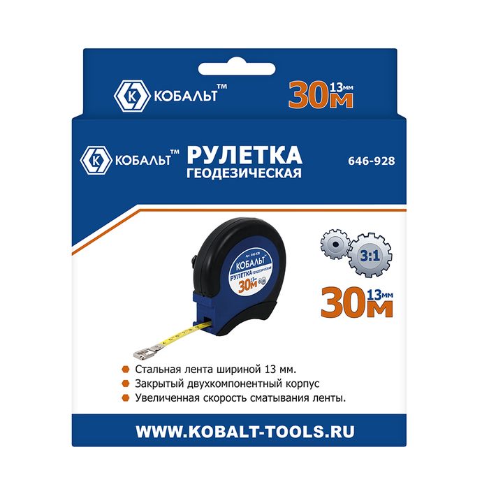 Рулетка геодезическая КОБАЛЬТ 30м x 13мм закрытый двухкомпонентный корпус, стальная лента, ускоренная перемотка (646-928) - цена, фото, технические характеристики