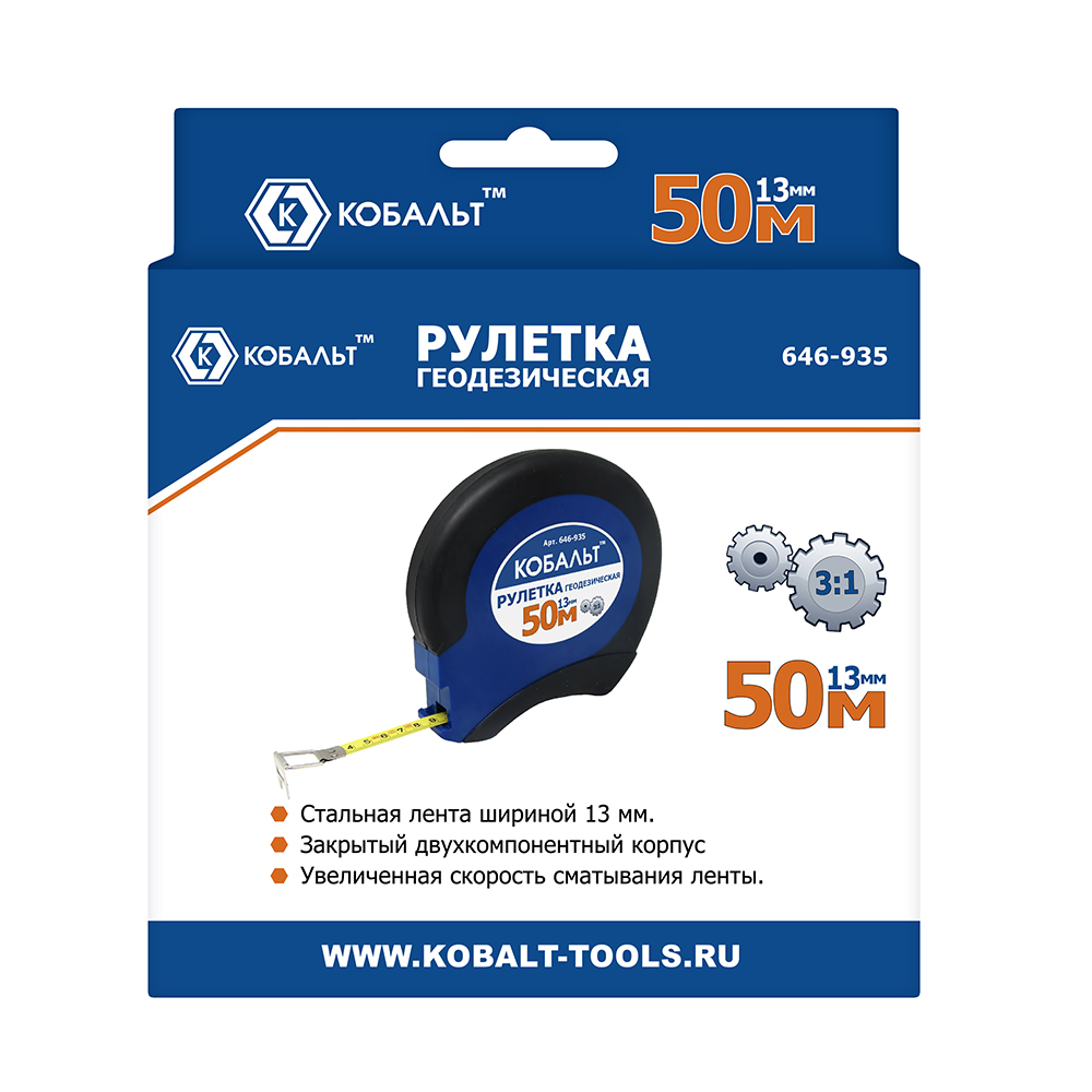 Рулетка геодезическая КОБАЛЬТ 50м x 13мм закрытый двухкомпонентный корпус, стальная лента, ускоренная перемотка (646-935) - цена, фото, технические характеристики