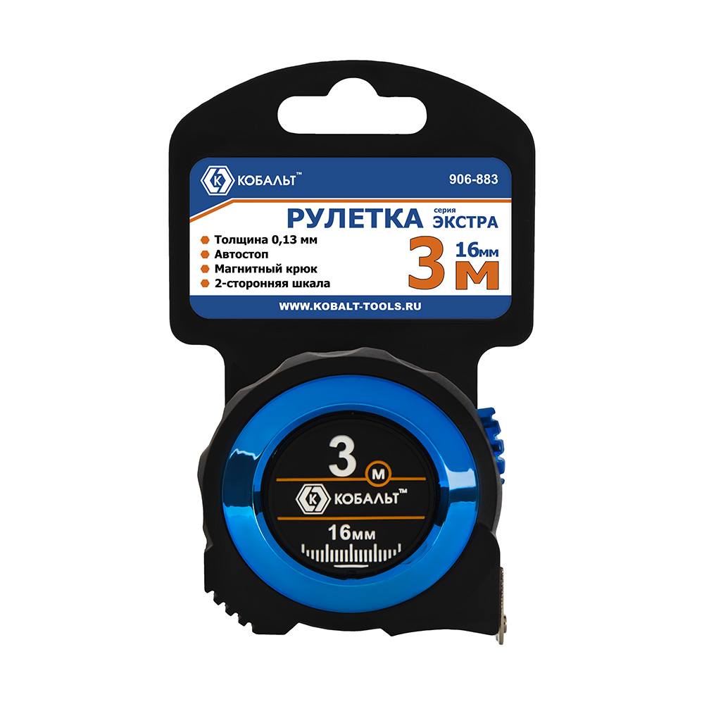 Рулетка КОБАЛЬТ Экстра 3м x 16мм, металлический корпус, толщина ленты 0,13 мм, автостоп, магнит, 2 стор. шкала (906-883) - цена, фото, технические характеристики