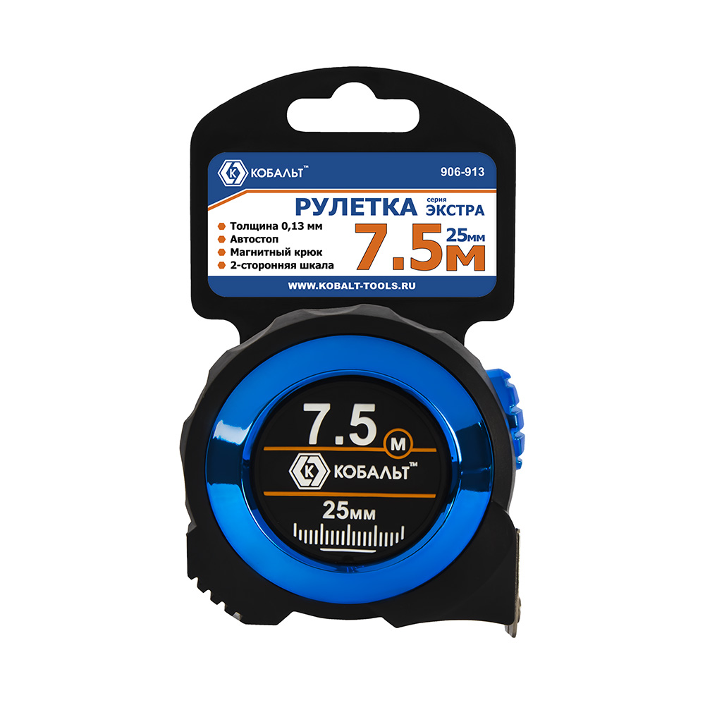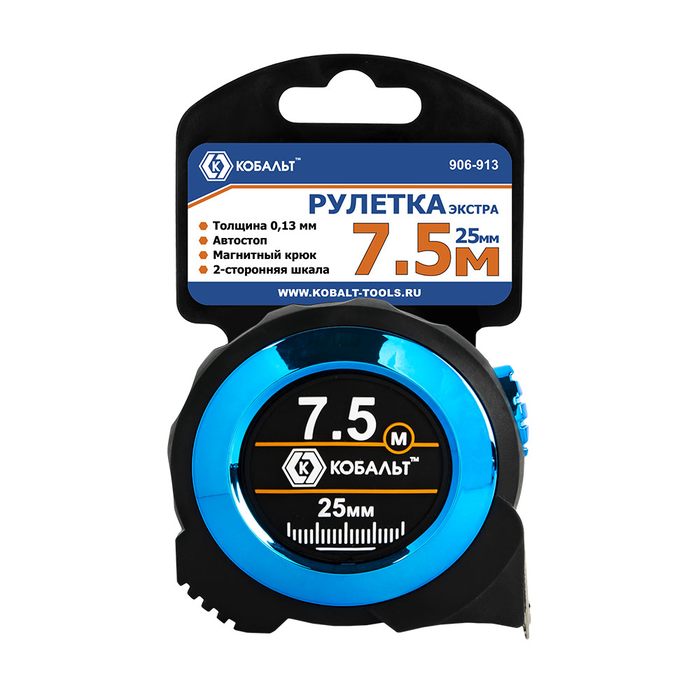 Рулетка КОБАЛЬТ Экстра 7.5м x 25мм, металлический корпус, толщина ленты 0,13 мм, автостоп, магнит, 2 стор. шкала (906-913) - цена, фото, технические характеристики