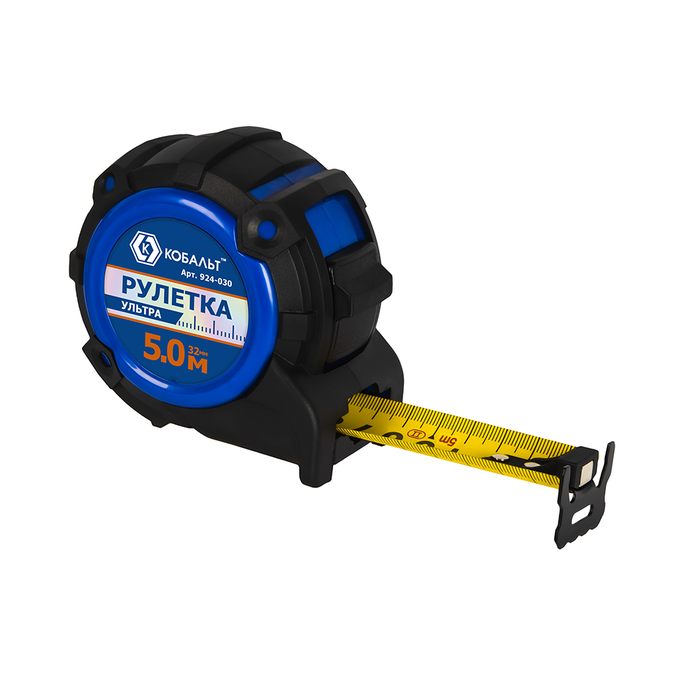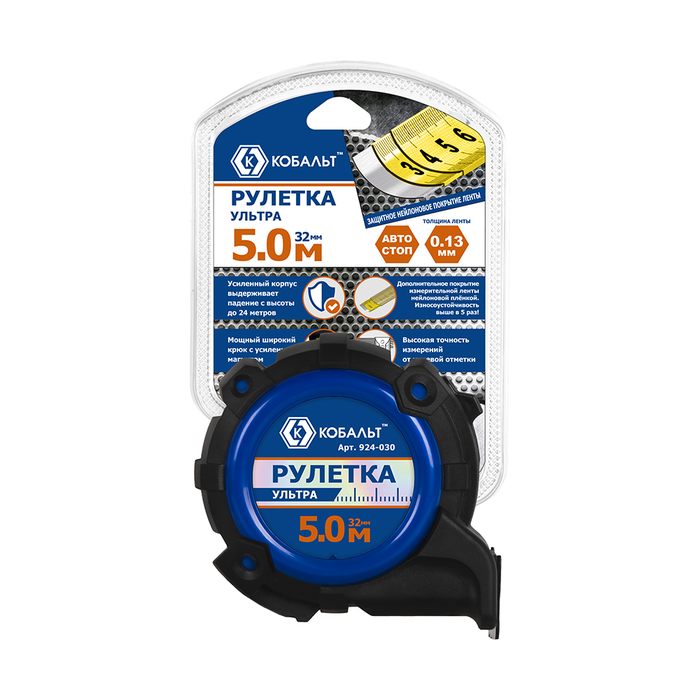 Рулетка КОБАЛЬТ УЛЬТРА 5м х 32мм, обрезиненный корпус, нейл. покр. ленты 0.13 мм, широкий магнит, усиленный стопор, блист. подвес (924-030) - цена, фото, технические характеристики