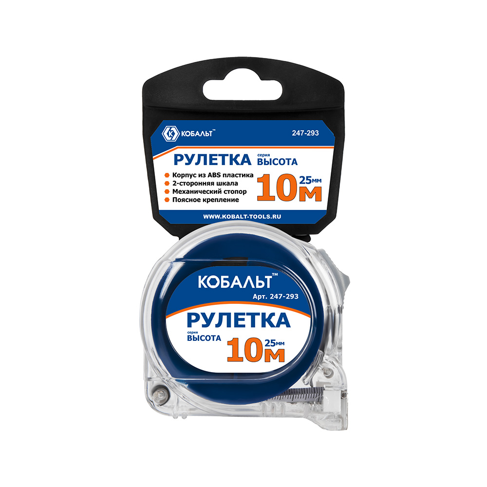 Рулетка КОБАЛЬТ Высота 10м x 25мм прозрачный корп., мех.стопор, 2-х стор. шкала, белое мат. покрытие ленты, толщина ленты 0.11 мм (247-293) - цена, фото, технические характеристики