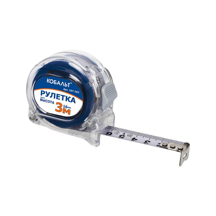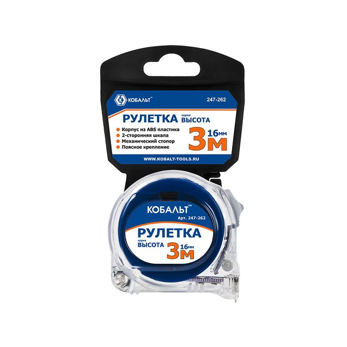 Рулетка КОБАЛЬТ Высота 3м x 16мм прозрачный корп., мех.стопор, 2-стор. шкала, белое мат. покрытие ленты, толщина ленты 0.11 мм (247-262) - цена, фото, технические характеристики