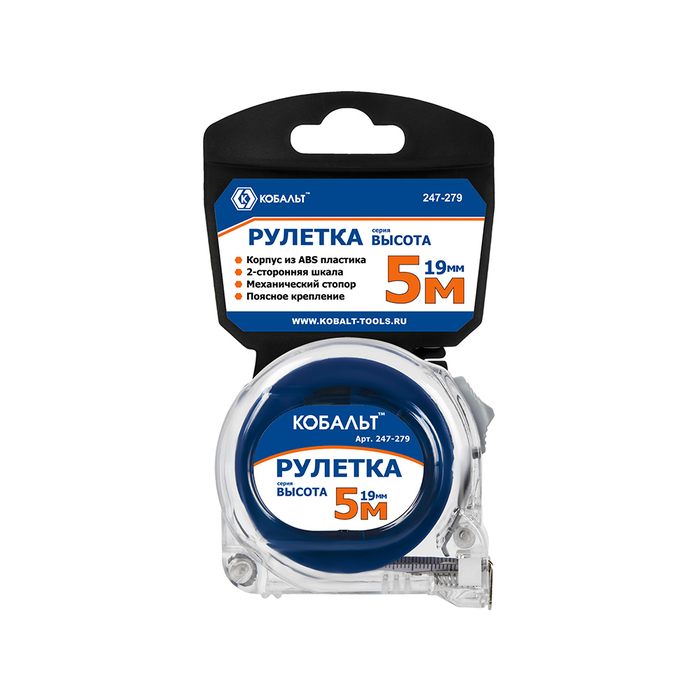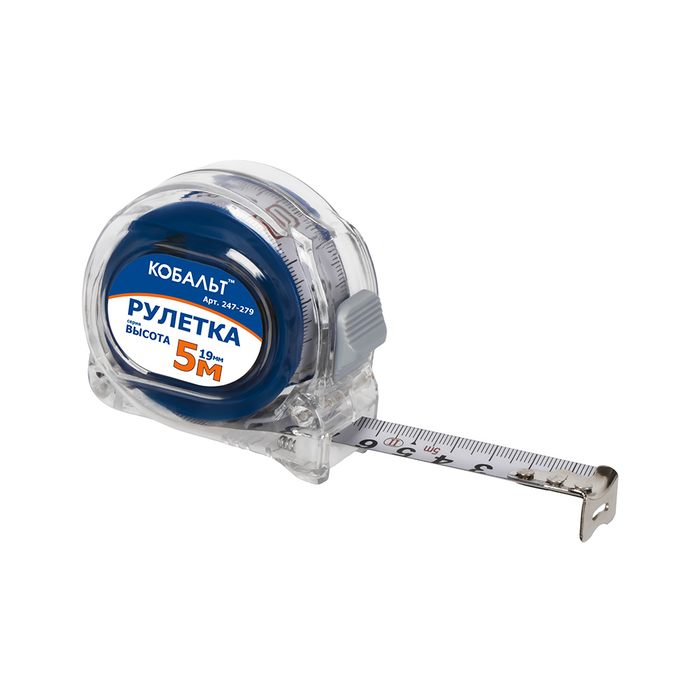 Рулетка КОБАЛЬТ Высота 5м x 19мм прозрачный корп., мех.стопор, 2-стор. шкала, белое мат. покрытие ленты, толщина ленты 0.11 мм (247-279) - цена, фото, технические характеристики