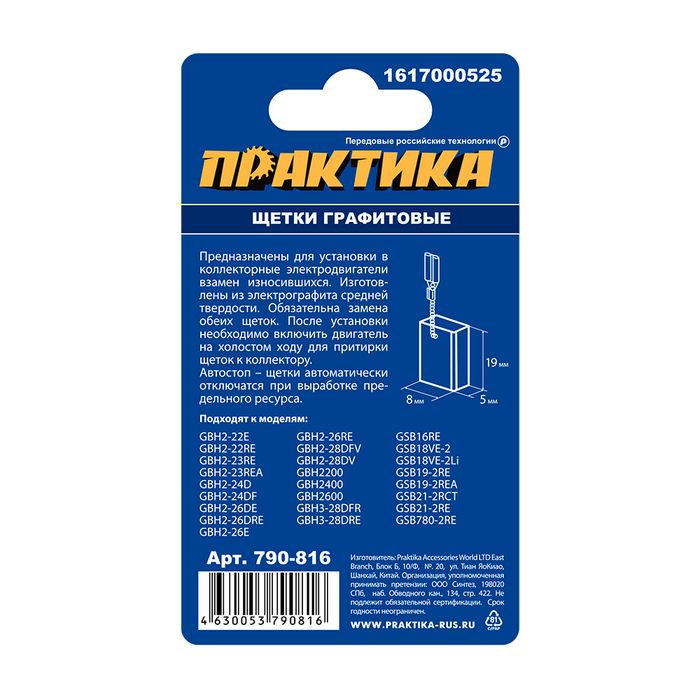 Щетка графитовая для BOSCH ПРАКТИКА (аналог 1617000525) 5x8x19 мм, автостоп (790-816) - цена, фото, технические характеристики