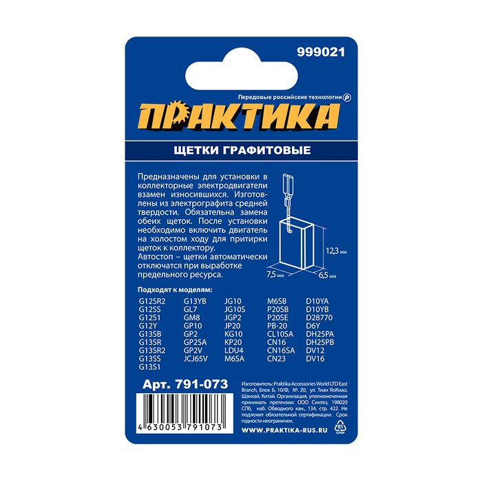 Щетка графитовая для HITACHI ПРАКТИКА (аналог 999021) с пружиной, 6,5x7,5x12,3мм, автостоп (791-073)