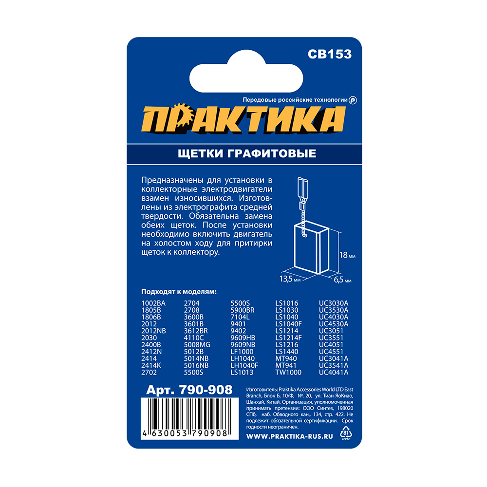 Щетка графитовая для MAKITA ПРАКТИКА (аналог CB-153/арт.181044-0) с пружиной, 6,5x13,5x18 мм, автостоп (790-908)