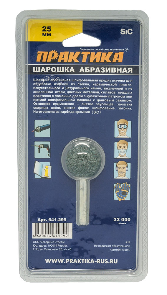 Шарошка абразивная ПРАКТИКА карбид кремния, шарообразная 25мм, хвост 6мм, блистер (641-299) - цена, фото, технические характеристики