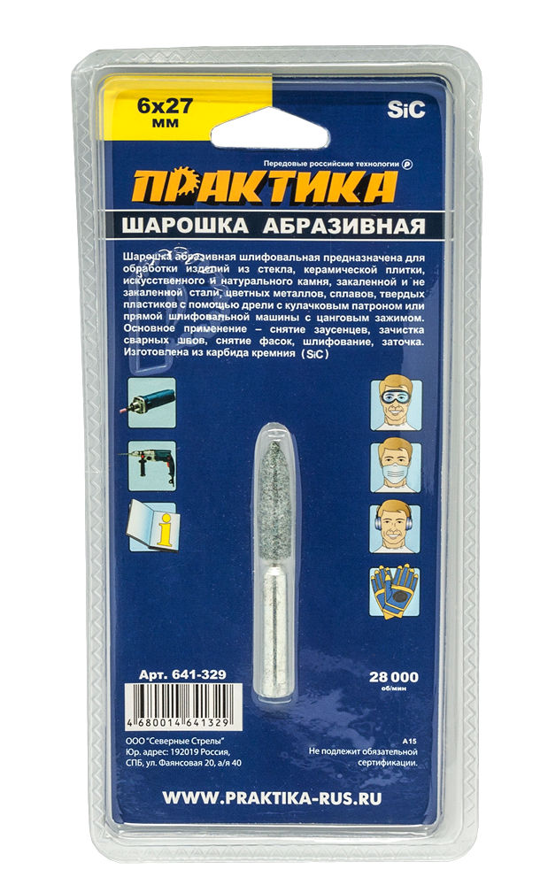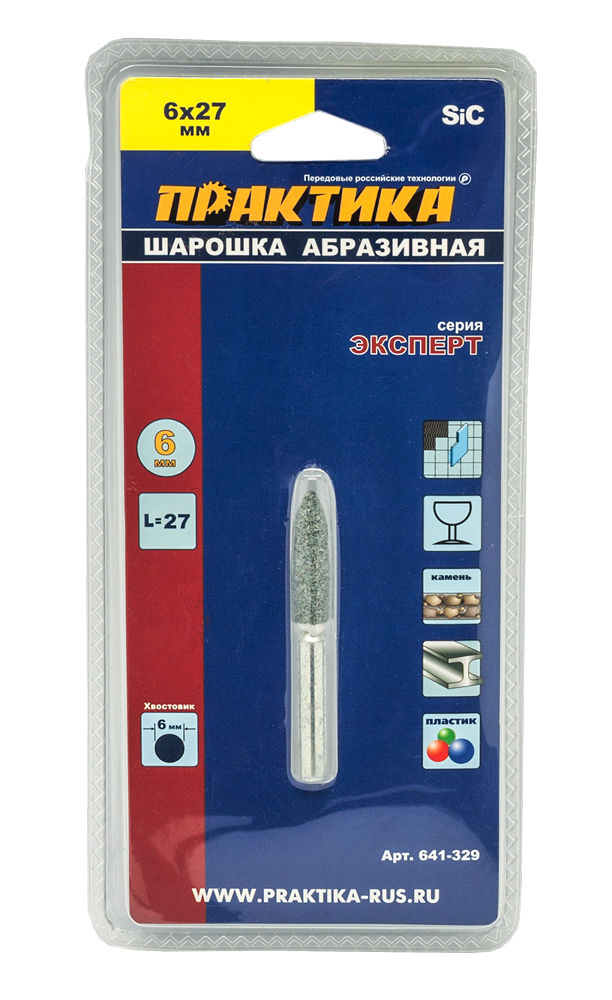 Шарошка абразивная ПРАКТИКА карбид кремния, цилиндрическая заостренная 6х27 мм, хвост 6 м (641-329) блистер