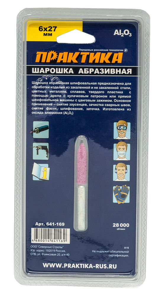 Шарошка абразивная ПРАКТИКА оксид алюминия, цилиндрическая заостренная 6х27 мм, хвост 6 м (641-169) блистер