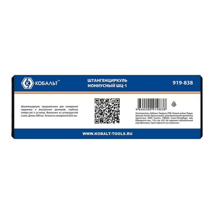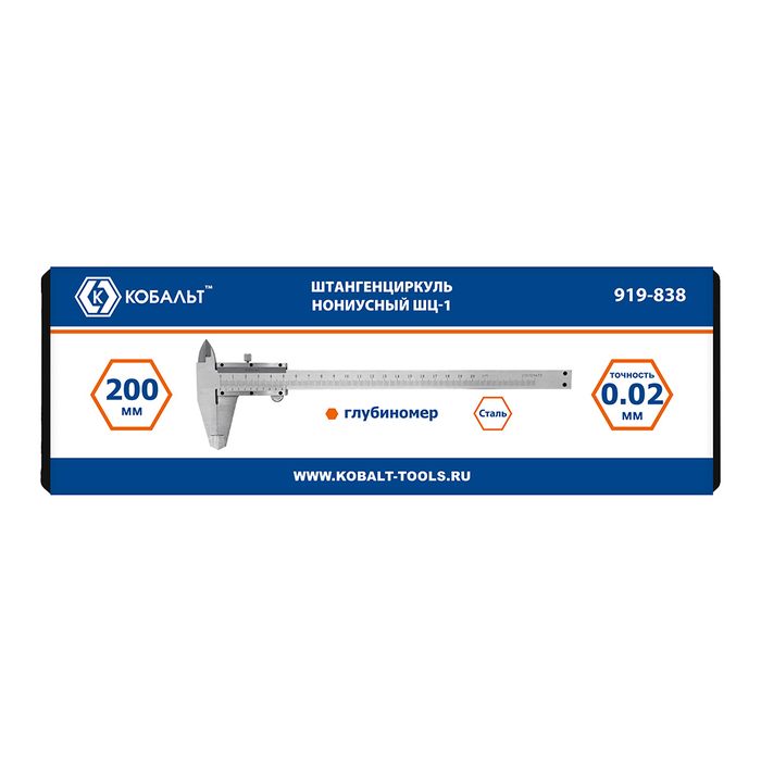 Штангенциркуль КОБАЛЬТ нониусный, ШЦ-1, открытого типа, 200 мм, точность 0,02 мм, глубиномер, углер. сталь, кейс (919-838) - цена, фото, технические характеристики