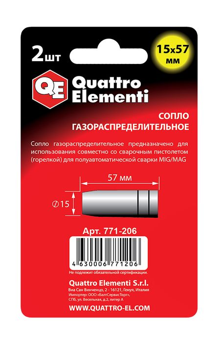 Сопло газораспределительное QUATTRO ELEMENTI 15 х 57 мм (2 шт) в блистере, для горелки пол (771-206) - цена, фото, технические характеристики