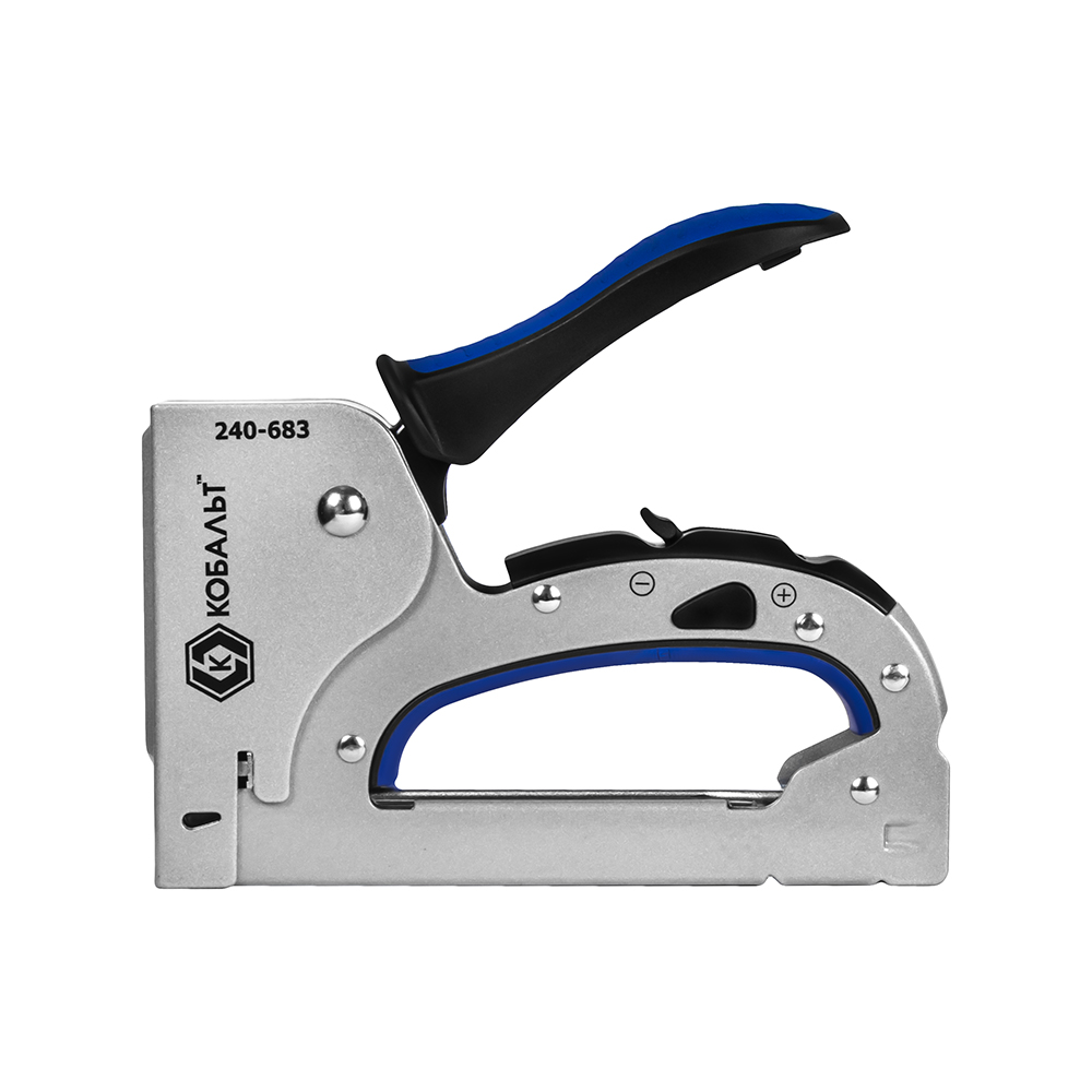 Степлер механический КОБАЛЬТ 3 в 1, скобы 6-14мм, тип 53, шпильки до 14мм, гвозди до 14мм, цель/мет.корп.,рег.удара,прорез.рук-ка (240-683) - цена, фото, технические характеристики