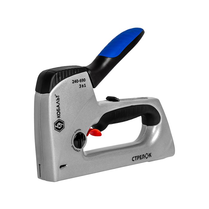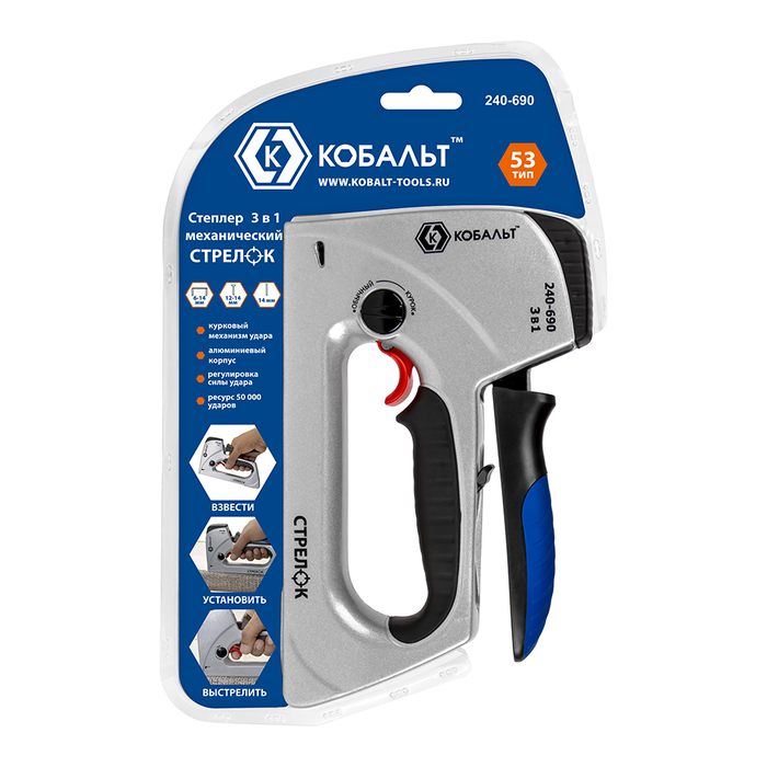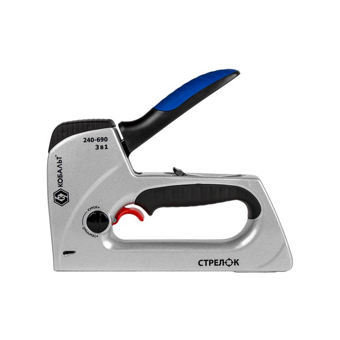 Степлер механический КОБАЛЬТ СТРЕЛОК, алюм.корп., скобы 6-14 мм, тип 53, шпильки 12-14 мм, гвозди 14 мм, рег.удара, спуск.крючок (240-690) - цена, фото, технические характеристики
