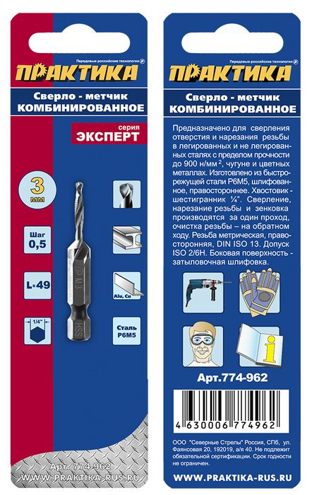 Сверло метчик ПРАКТИКА М3, шаг 0,5, длина 49 мм, хвостовик HEX 1/4', блистер (774-962) - цена, фото, технические характеристики