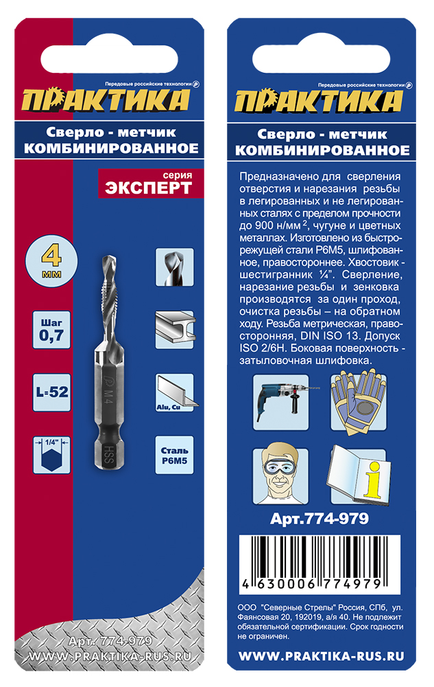 Сверло метчик ПРАКТИКА М4 шаг 0,7, длина 52 мм, хвостовик HEX 1/4', блистер (774-979) - цена, фото, технические характеристики