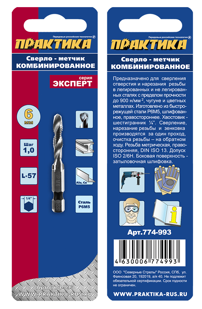 Сверло метчик ПРАКТИКА М6 шаг 1,0, длина 57 мм, хвостовик HEX 1/4', блистер (774-993) - цена, фото, технические характеристики