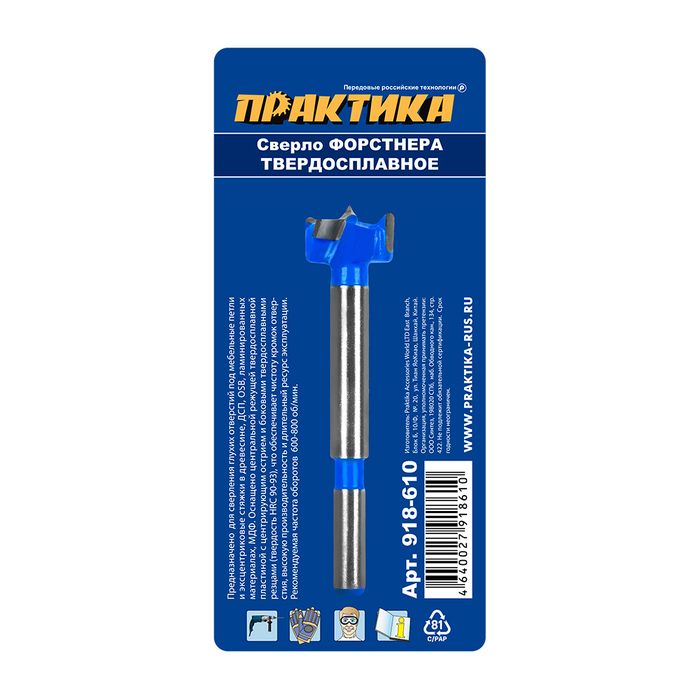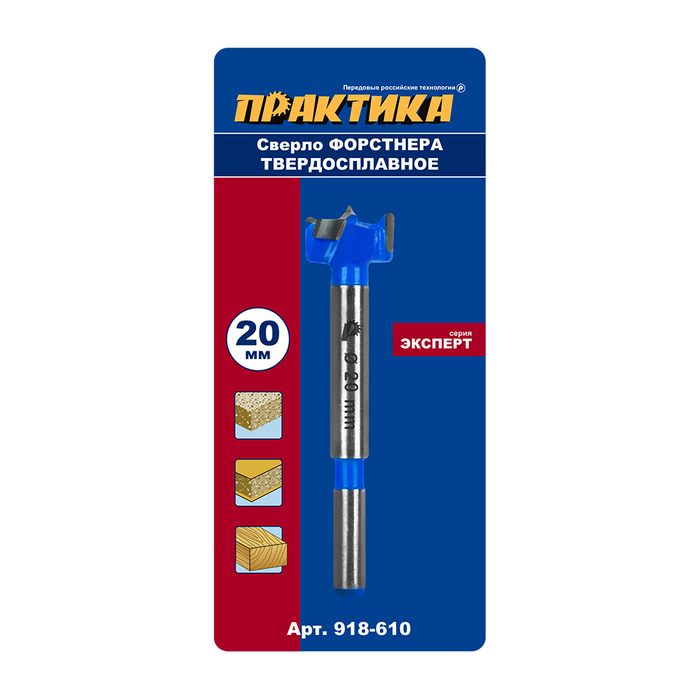 Сверло петельное Форстнера ПРАКТИКА 20 мм, твердосплавное, (1шт), блистер (918-610) - цена, фото, технические характеристики