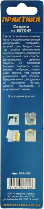 Сверло по бетону ПРАКТИКА 10 х 120 мм (1шт.) блистер, серия Мастер (034-106) - цена, фото, технические характеристики