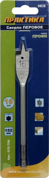 Сверло по дереву перовое ПРАКТИКА 16 х 152 мм (1шт.) блистер (032-768) - цена, фото, технические характеристики