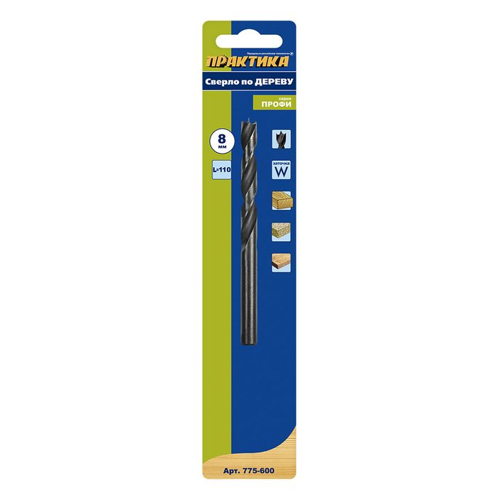 Сверло по дереву ПРАКТИКА 8 х 110 мм, W-заточка, (1шт.) блистер, серия Профи (775-600) W-заточка, (1шт.) блистер, серия Профи