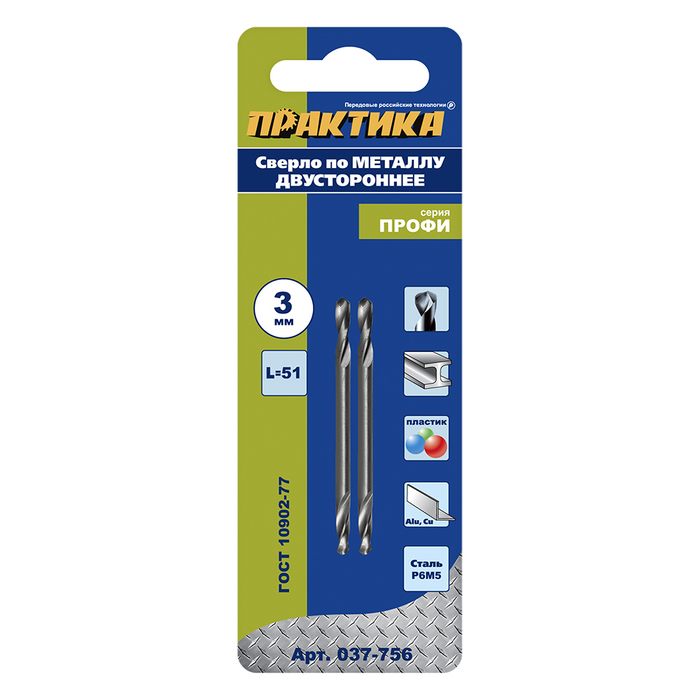 Сверло по металлу двустороннее ПРАКТИКА Р6М5 3,0 х 51 мм (2шт.) блистер (037-756) - цена, фото, технические характеристики