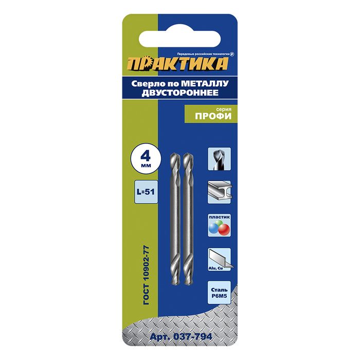 Сверло по металлу двустороннее ПРАКТИКА Р6М5 4,0 х 51 мм (2шт.) блистер (037-794) - цена, фото, технические характеристики