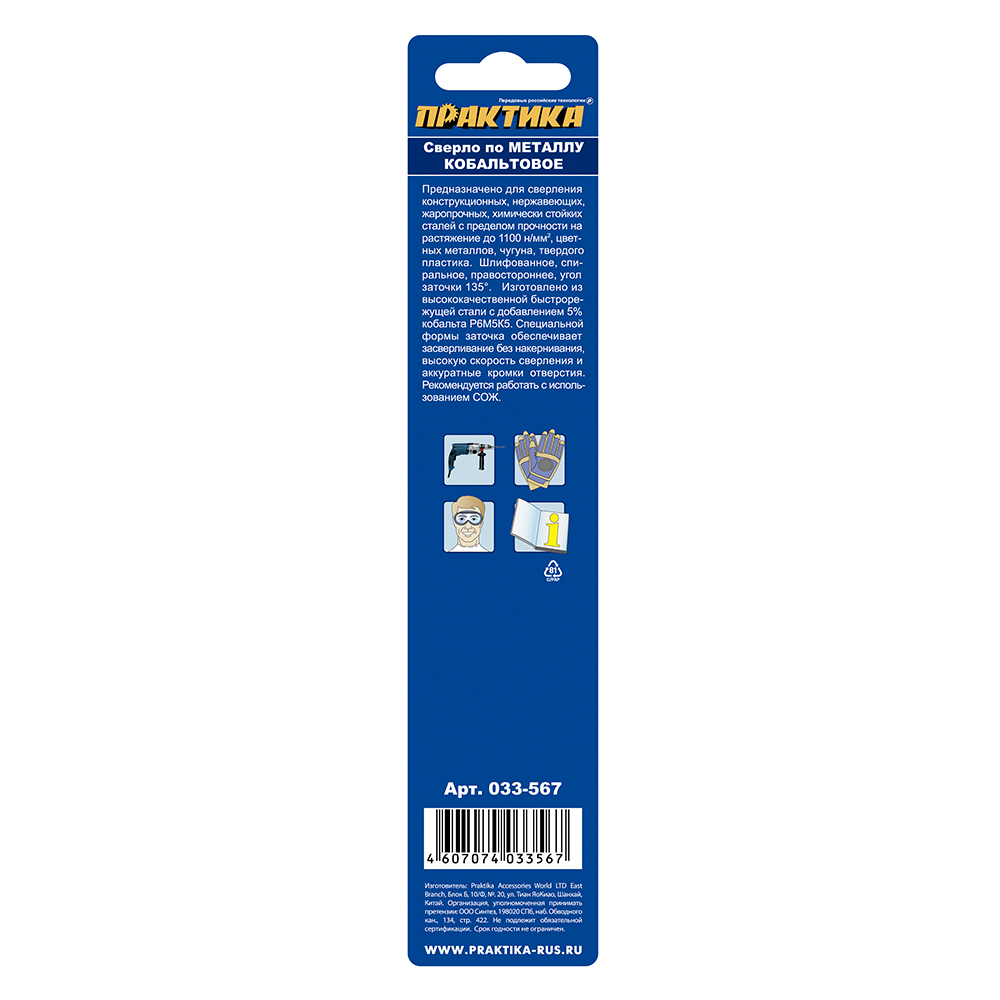 Сверло по металлу кобальтовое ПРАКТИКА 10,0 х 133 мм Р6М5К5, (1шт.) блистер (033-567) - цена, фото, технические характеристики