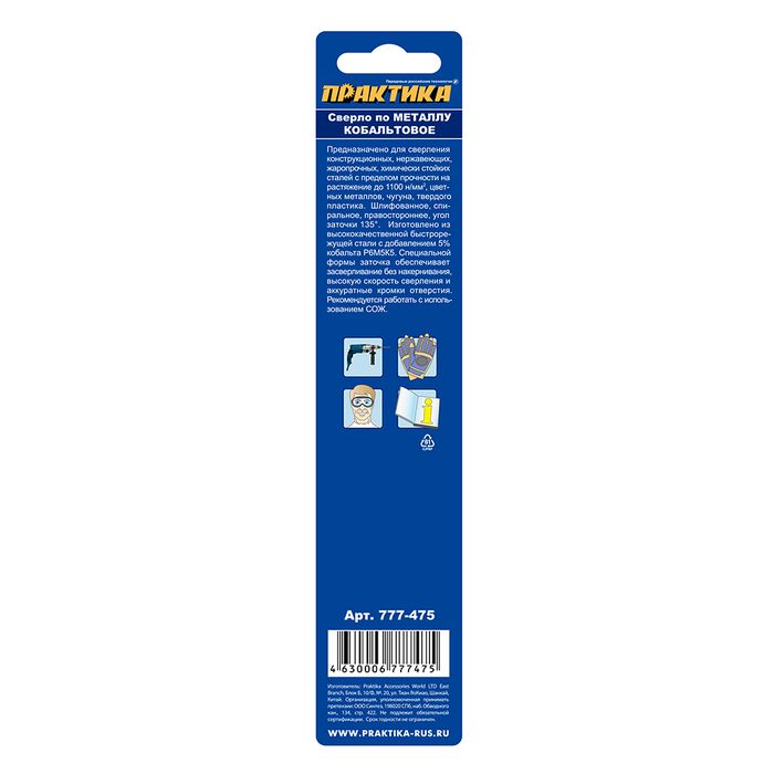 Сверло по металлу кобальтовое ПРАКТИКА 13,0 х 151 мм Р6М5К5, (1шт.) блистер (777-475) Р6М5К5, (1шт.) блистер