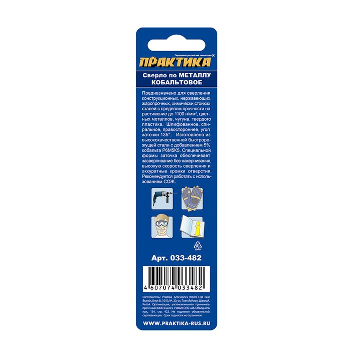Сверло по металлу кобальтовое ПРАКТИКА 4,8 х 86 мм Р6М5К5, (1шт.) блистер (033-482) - цена, фото, технические характеристики
