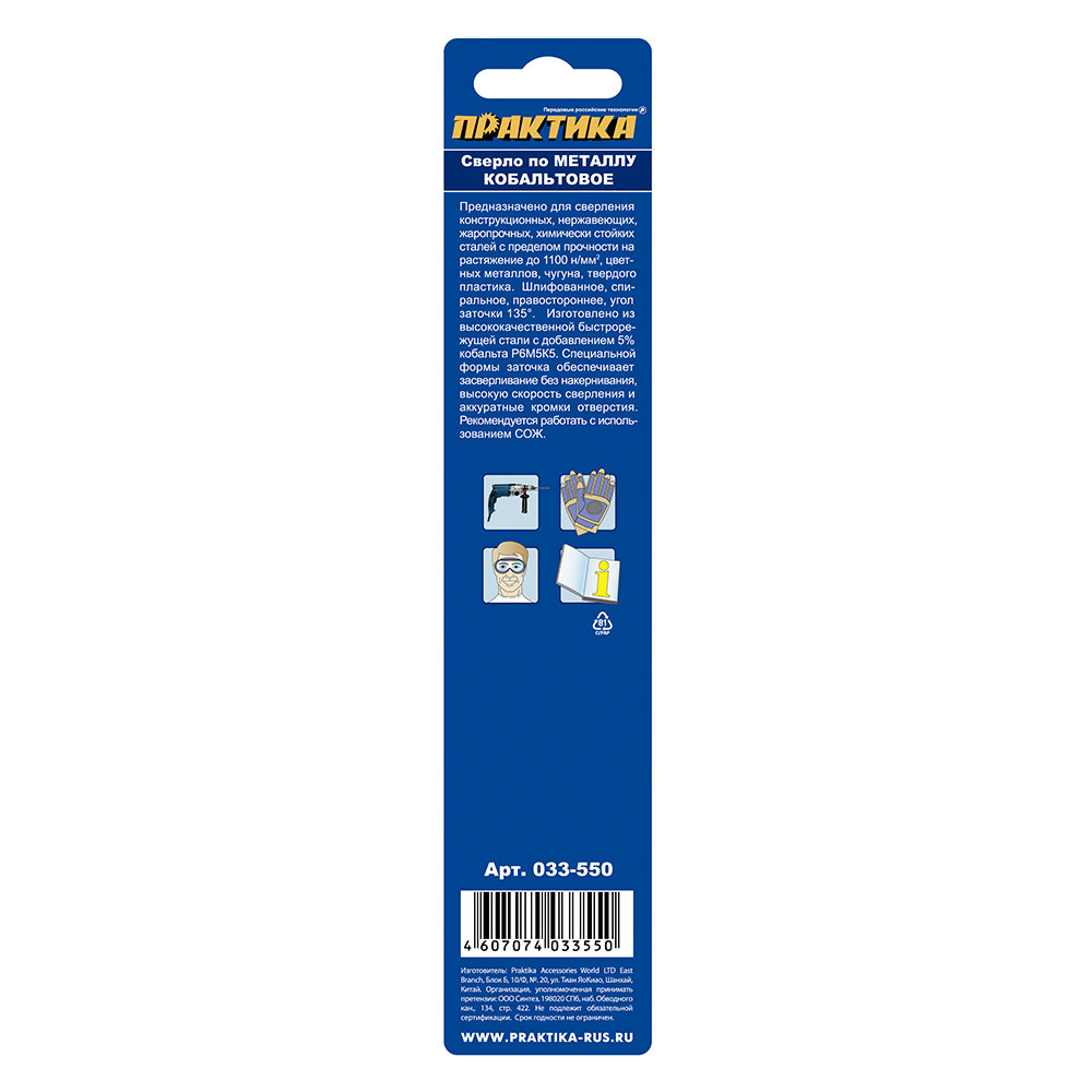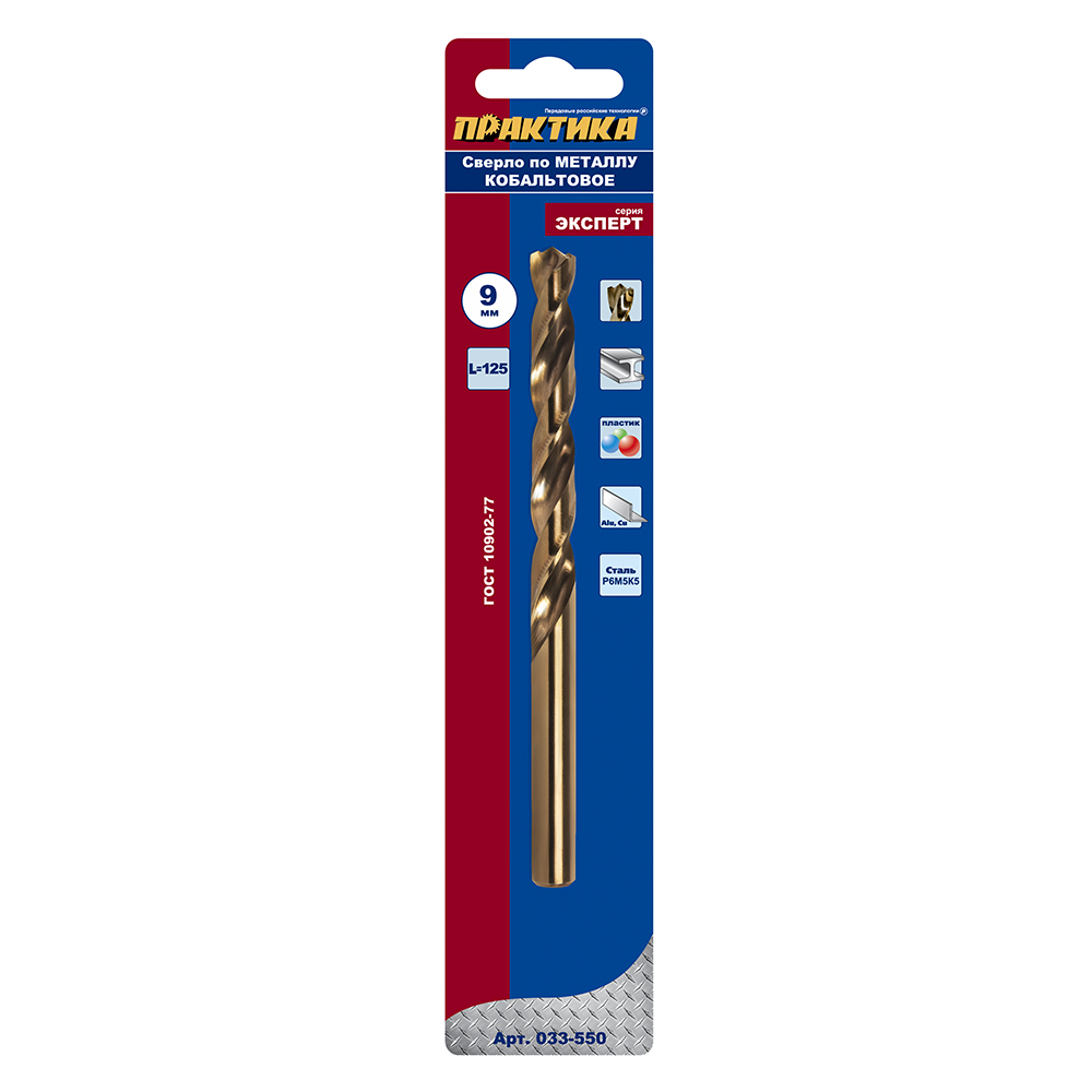 Сверло по металлу кобальтовое ПРАКТИКА 9,0 х 125 мм Р6М5К5, (1шт.) блистер (033-550) - цена, фото, технические характеристики