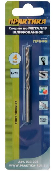 Сверло по металлу ПРАКТИКА Р6М5 4,0 х 75 мм (1шт.) блистер (033-208) - цена, фото, технические характеристики