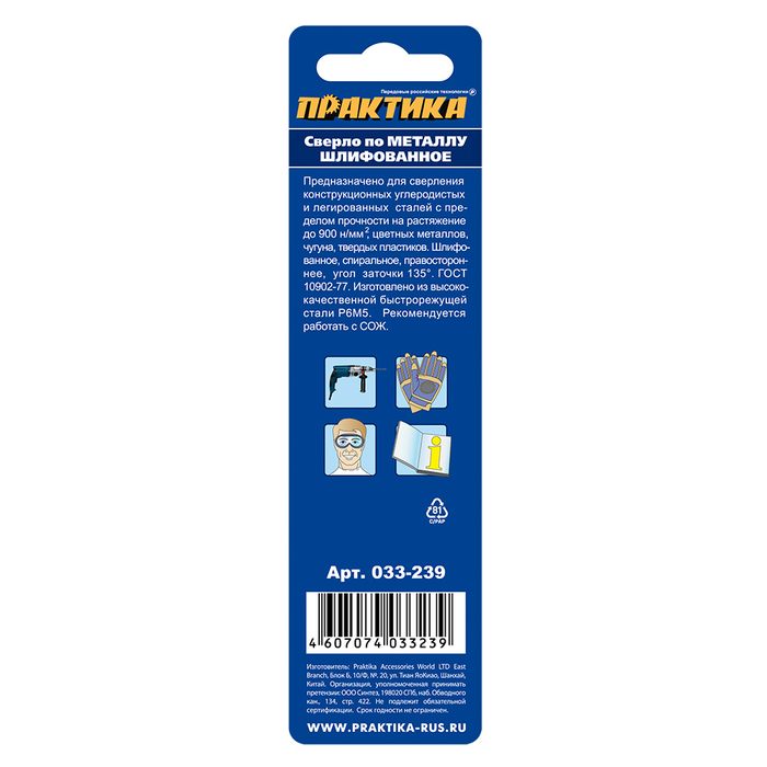 Сверло по металлу ПРАКТИКА Р6М5 4,8 х 86 мм (1шт.) блистер (033-239) - цена, фото, технические характеристики