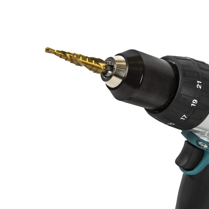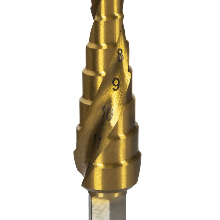 Сверло по металлу ступенчатое спиральное ПРАКТИКА 4-12мм, шаг 1мм, хвост.1/4", ЭКСПЕРТ хвост 1/4", кобальтовое покрытие