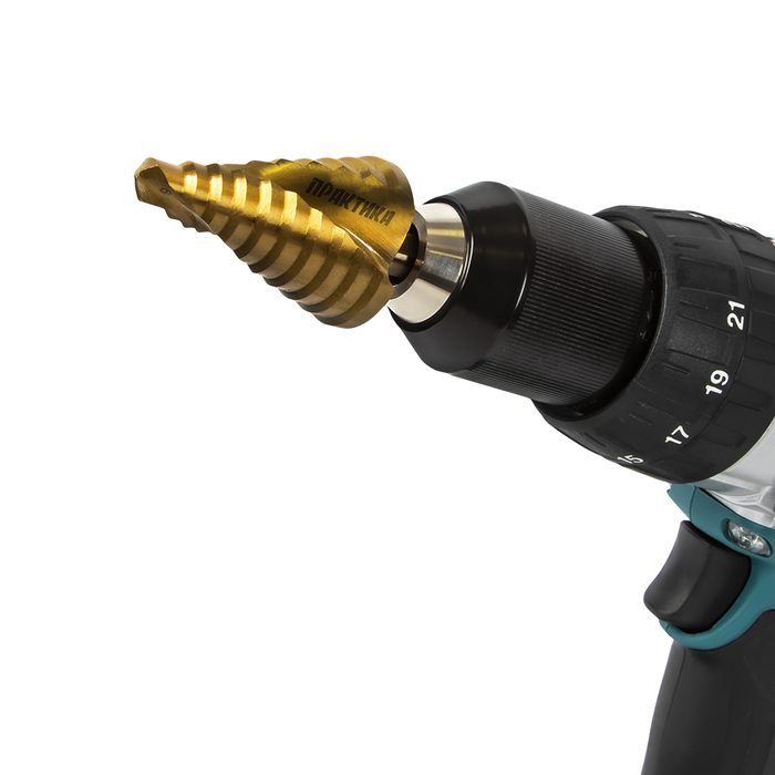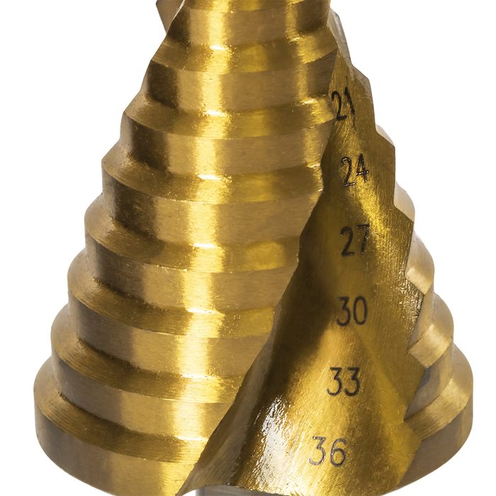 Сверло по металлу ступенчатое спиральное ПРАКТИКА 9-36мм, шаг 3мм, 3-х гран.хвост.10мм, ЭКСПЕРТ 3-х гран.хвост. 10мм, кобальт.покр.